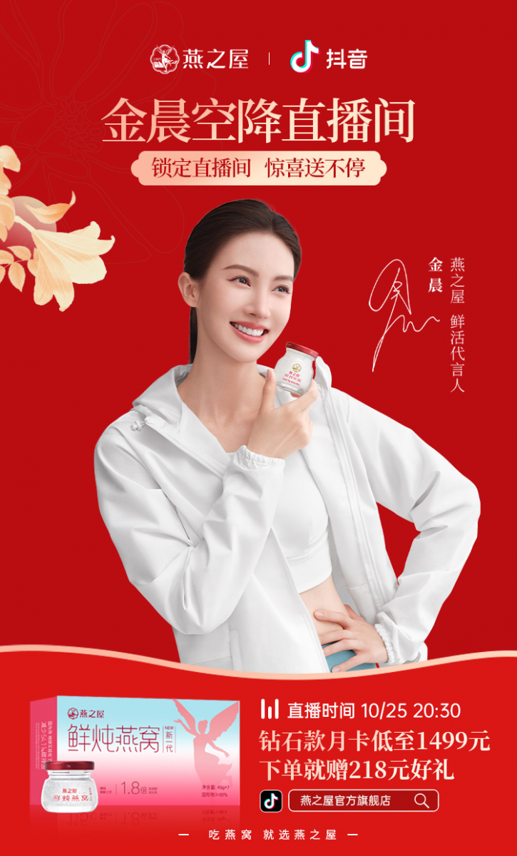 10月25日,燕之屋官宣青年演員、舞者金晨成為燕之屋鮮活代言人。同日,金晨作為燕之屋鮮活代言人,亮相燕之屋官方直播間,與主持人馬銳歡樂(lè )互動(dòng),直播間反響熱烈。