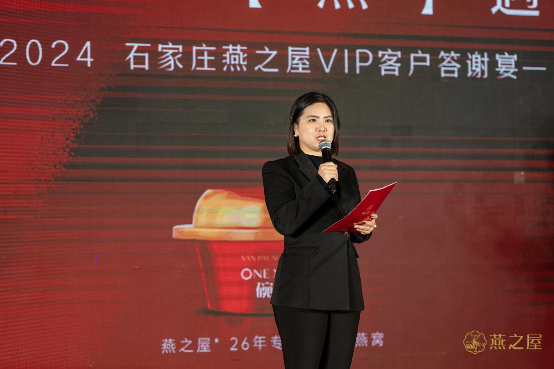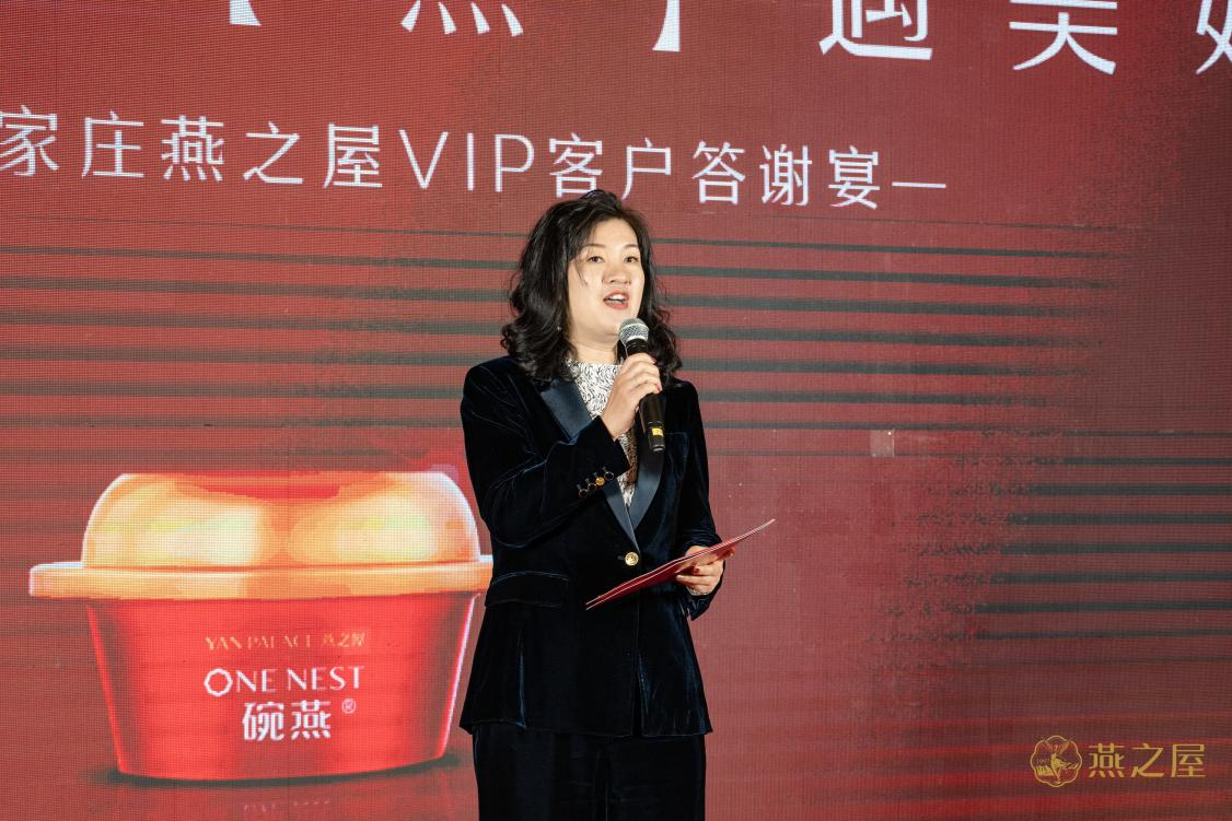 在熱烈的掌聲中,燕之屋石家莊合作商、河北法桐商貿有限公司總經(jīng)理趙寧上臺致辭,她說(shuō)道:“在這個(gè)特殊的場(chǎng)合,我想表達我們對每一位貴賓的深深感激。正是因為有了您的支持,才有了今年燕之屋在香港的上市(股票代碼:01497.HK)。今年是燕之屋企業(yè)成立的26周年,26個(gè)寒暑走過(guò),我們初心不改,終于讓燕之屋成為了家喻戶(hù)曉的高端燕窩品牌,用品質(zhì)和服務(wù)征服了數以萬(wàn)計的客戶(hù)。”她與在座貴賓共同舉杯敬酒,向各位賓朋致以由衷謝意。