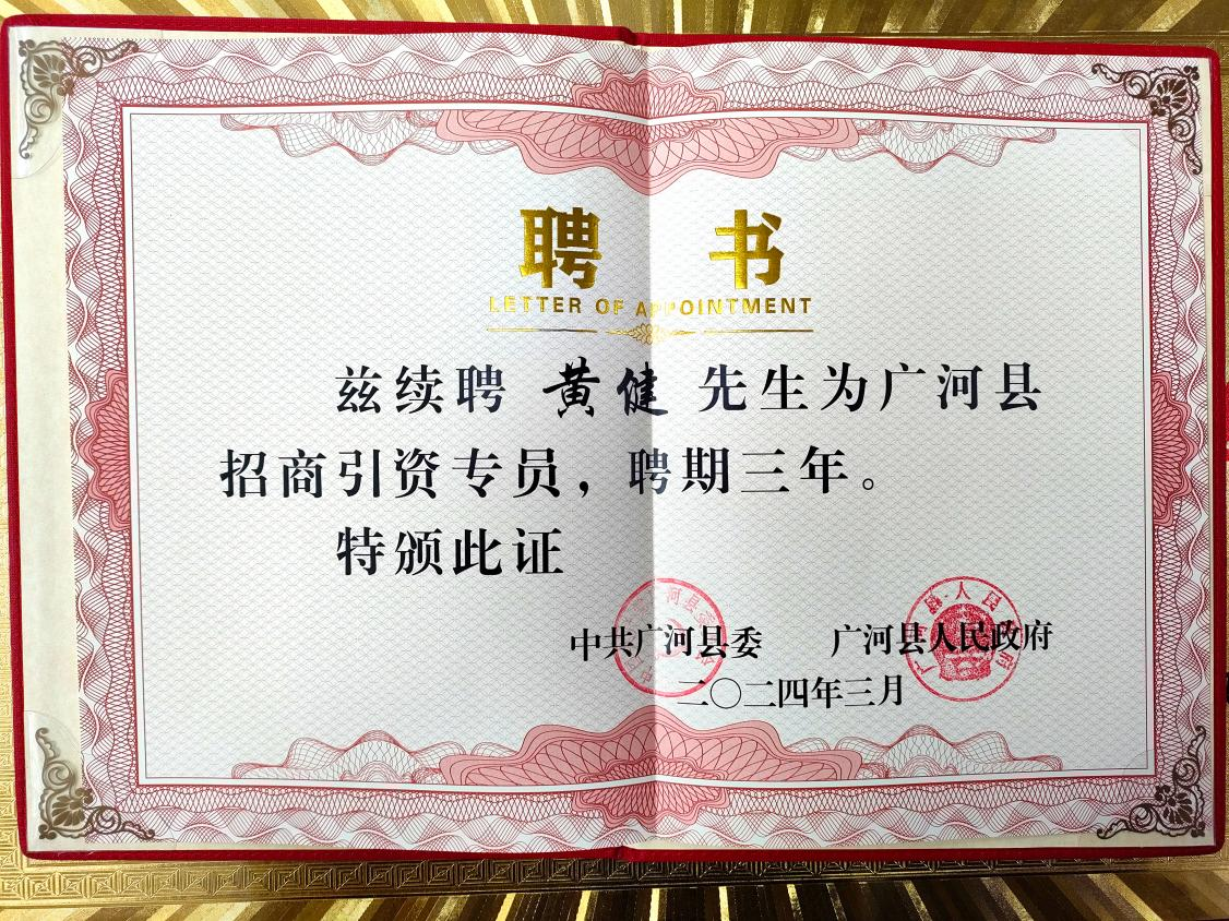 圖:燕之屋創(chuàng )始人、執行董事兼董事長(cháng)黃健被續聘為廣河縣招商引資專(zhuān)員