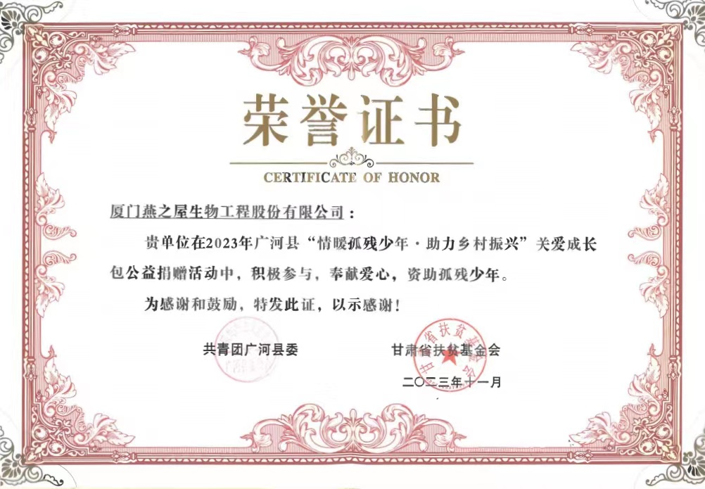 圖:燕之屋榮獲廣河縣“情暖孤殘少年·助力鄉村振興”關(guān)愛(ài)成長(cháng)包公益捐贈活動(dòng)榮譽(yù)證書(shū)