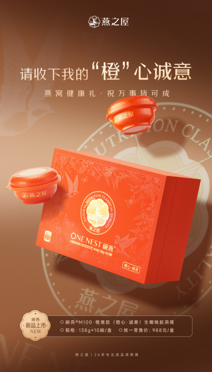 近日,燕之屋旗下高端燕窩品牌“碗燕”重磅推出新品碗燕®M100·橙意款(橙心·誠意)生椰桃膠燕窩,天然薈萃、匠心品質(zhì),呈現“橙”心誠意的燕窩健康禮,為日常送禮提供滋養優(yōu)選。